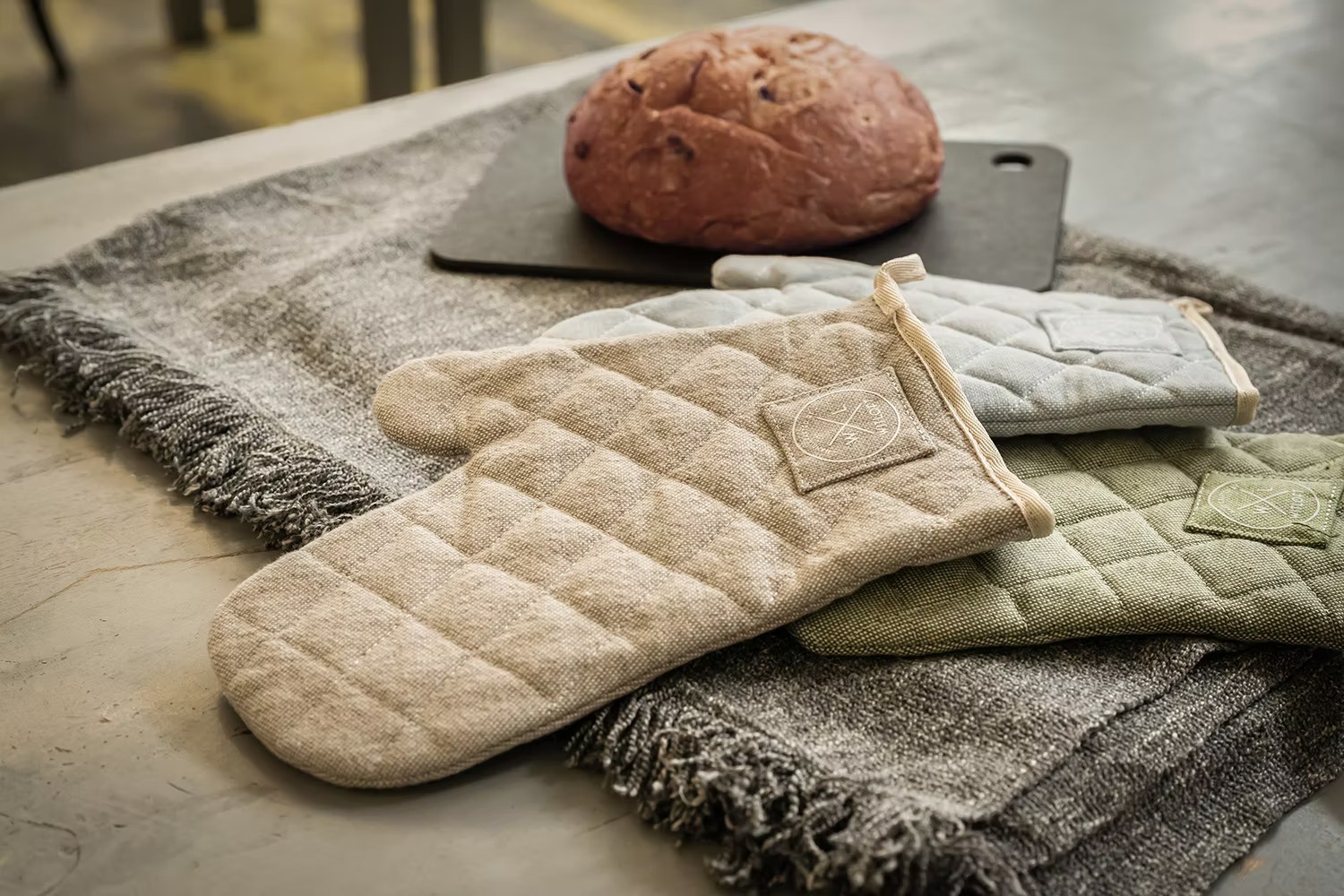 來自歐洲(荷蘭、比利時、丹麥、德國)的舊衣服,經由篩選、清洗並重新紡織而成,100% 回收材料,荷蘭在地製造,將廢棄紡織品再製為高品質、可清洗的環保隔熱手套與餐墊,不僅減少垃圾填埋,更體現了永續時尚的創意,獲得 GRS (Global Recycle Standard) 全球回收標準認證,具備高環保價值