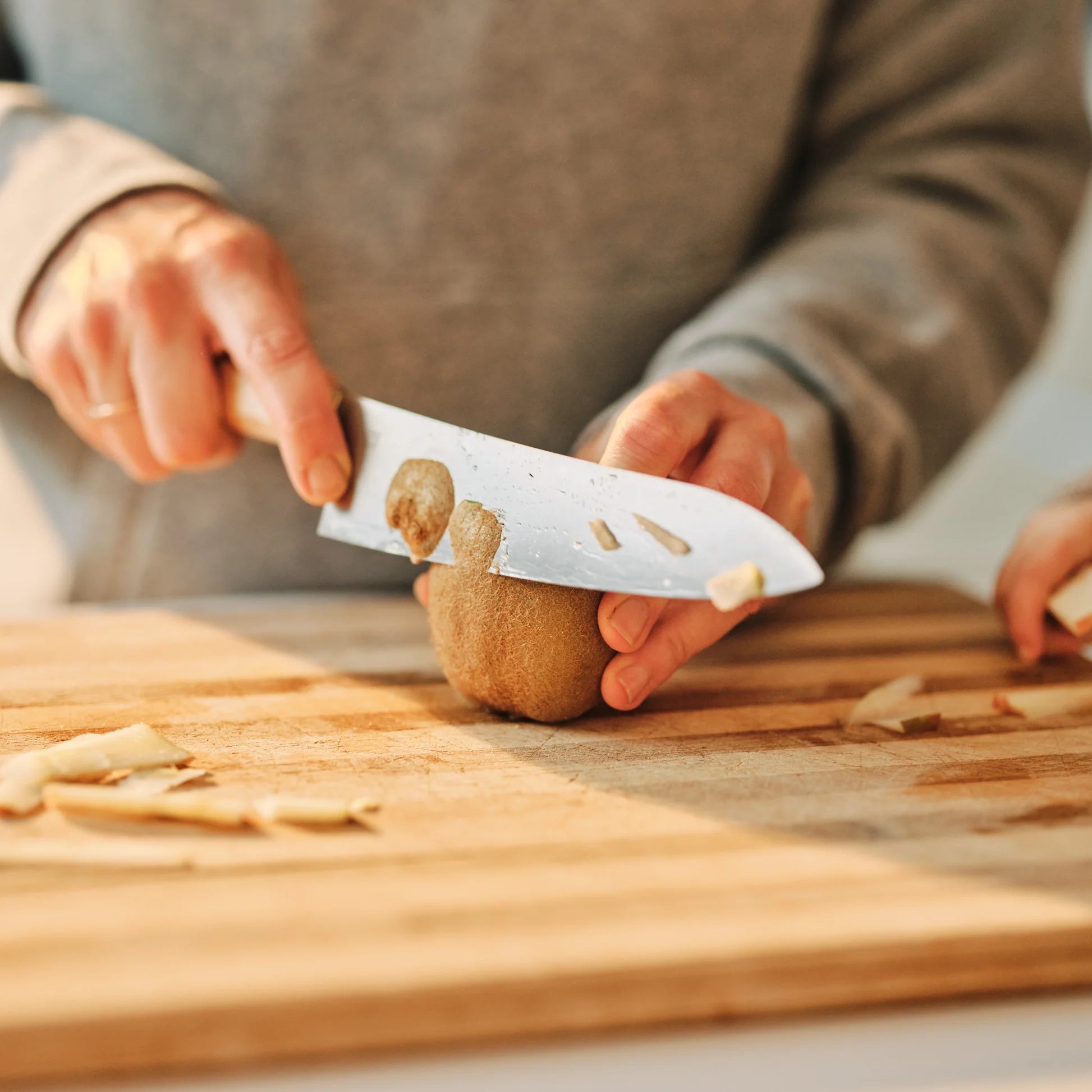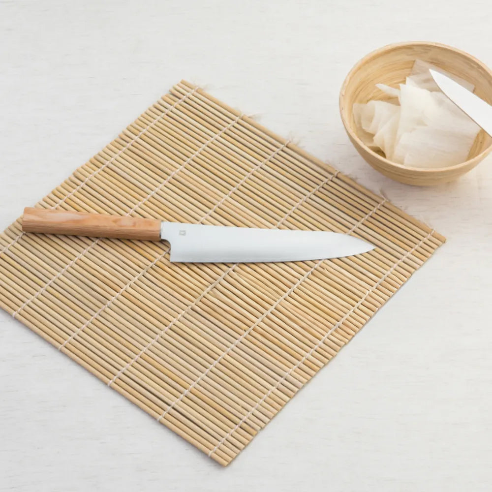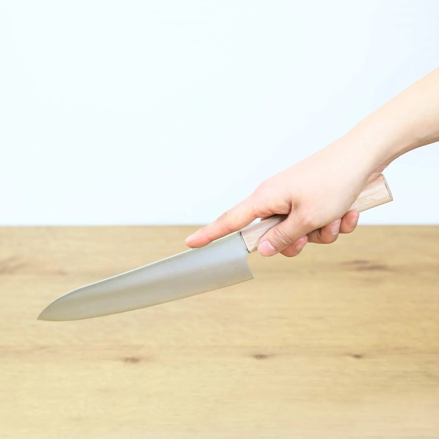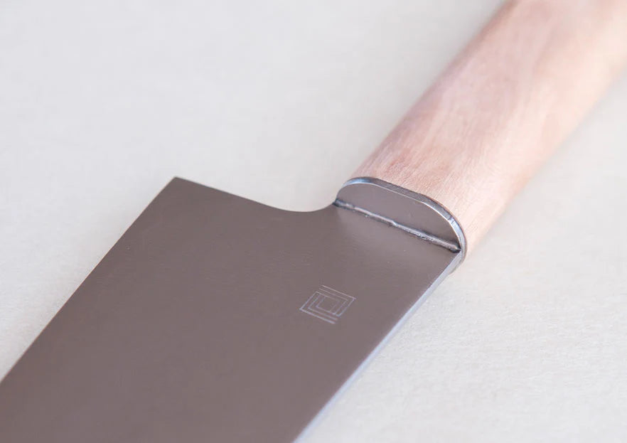 刀刃的設計,在於追求食材極薄的完美刀工,比任何一款刀具更勇於挑戰細切界限。優美的白色積層強化木,舒適的掌握手中,柄與刃接合處,有著職人的金屬蓋設計,又稱「口金」,細膩的工法,凸顯了溫柔的樣貌。